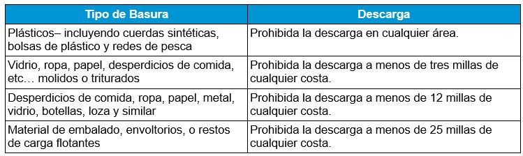 Tirar, descargar o depositar cualquier material de desecho (incluyendo basura, aceite o cualquier líquido contaminante) en las aguas de los Estados Unidos está prohibido por el Anexo V de la MARPOL 73/78.