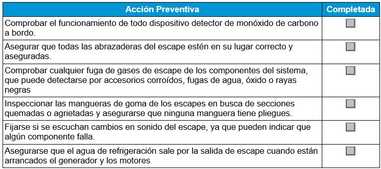 Un mantenimiento regular y un manejo adecuado de la embarcación son la mejor defensa del operador frente a posibles envenenamientos por monóxido de carbono. Además, a continuación se puede ver una lista de comprobación de medidas preventivas a completar antes de cada salida al agua: